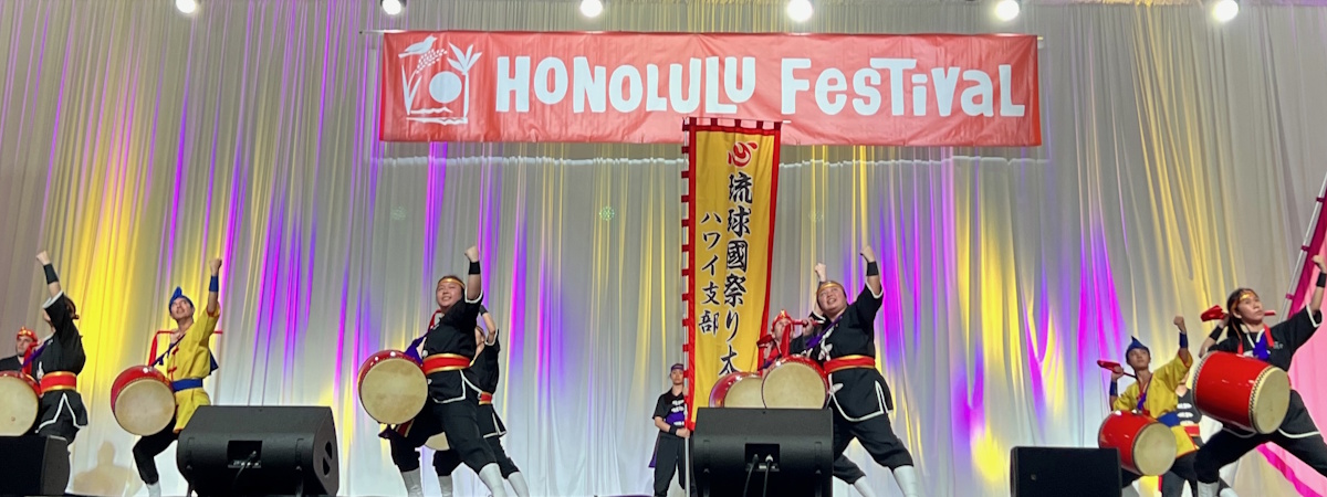 Ryukyukoku Matsuri Daiko Hawaii originated in Okinawa in 1982, combining traditional Eisa and Karate forms with contemporary influences and music to create a new and unique taiko style. The club has grown tremendously and now includes chapters all around the world. Our own Hawaii chapter now includes branches on Oahu and the Big Island. Ryukyukoku Matsuri Daiko's members are committed to working together to build and maintain cross-cultural friendships. We invite people of all ages and backgrounds to join us in exploring and perpetuating Okinawan culture through the art and spirit of taiko. In Japanese, we write our club name: 琉球國祭り太鼓ハワイ支部.